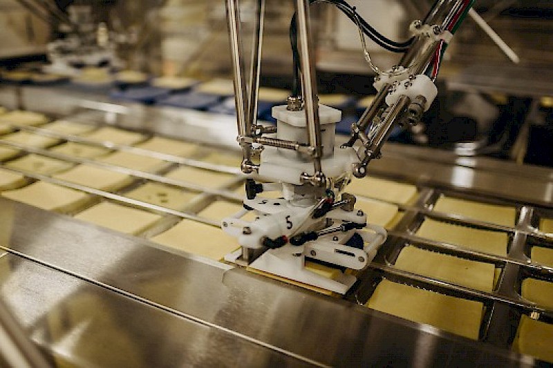Das absolute Highlight der Linie ist das neuartige Shuttlesystem. Anders als bei herkömmlichen Fertigungsstraßen werden die Käsescheiben nicht auf einem Förderband transportiert. Die von drei Hochleistungs-Slicern geschnittenen Scheiben landen auf Tabletts, die energieeffizient und äußerst hygienisch auf Magnetschienen laufen. Das Einlegen der nach Kundenwunsch ausgewählten Käsesorten übernehmen drei vollautomatische Pick-and-Place Roboter mit jeweils zwei Armen, die für eine nach definierten Vorgaben präzise Auffächerung der Scheiben sorgen. Diese können rund, quadratisch oder rechteckig sein: Die neue Verpackungsanlage ist so flexibel wie das Unternehmen, bei dem sie steht.