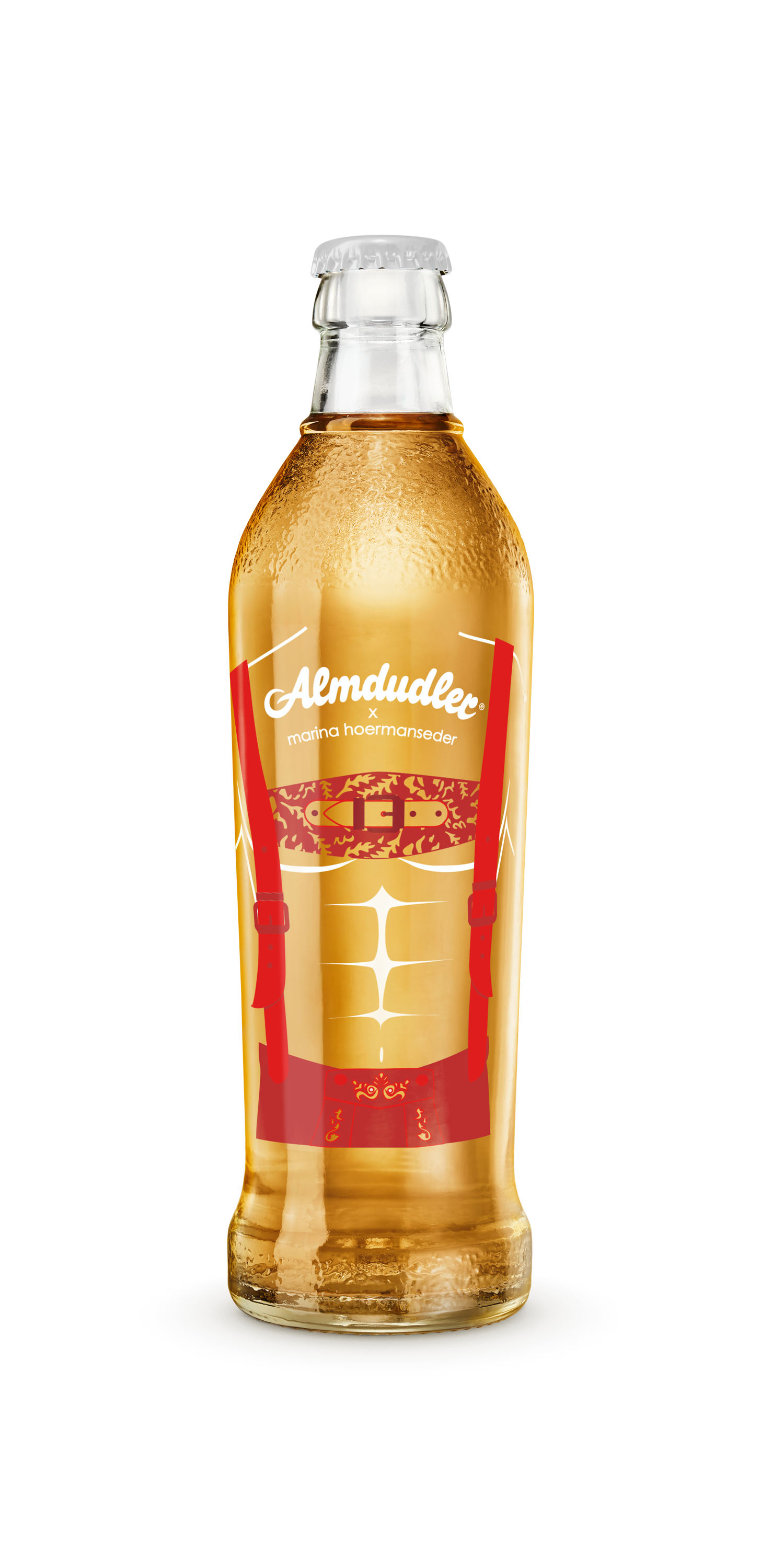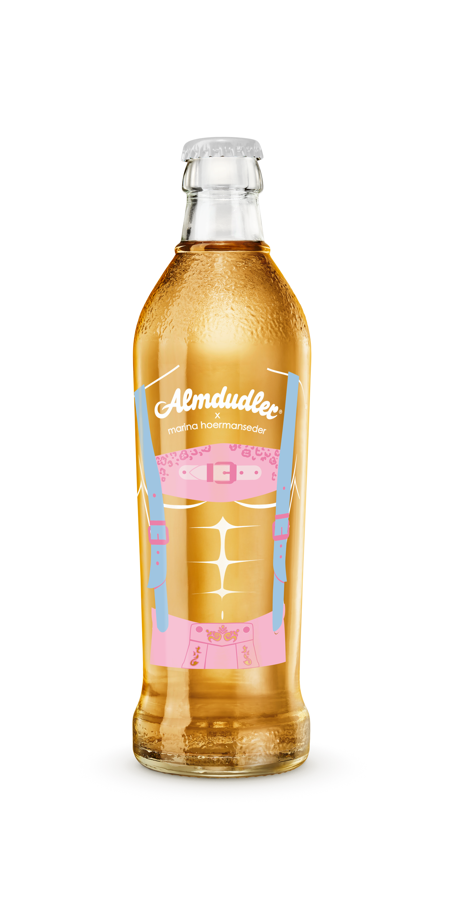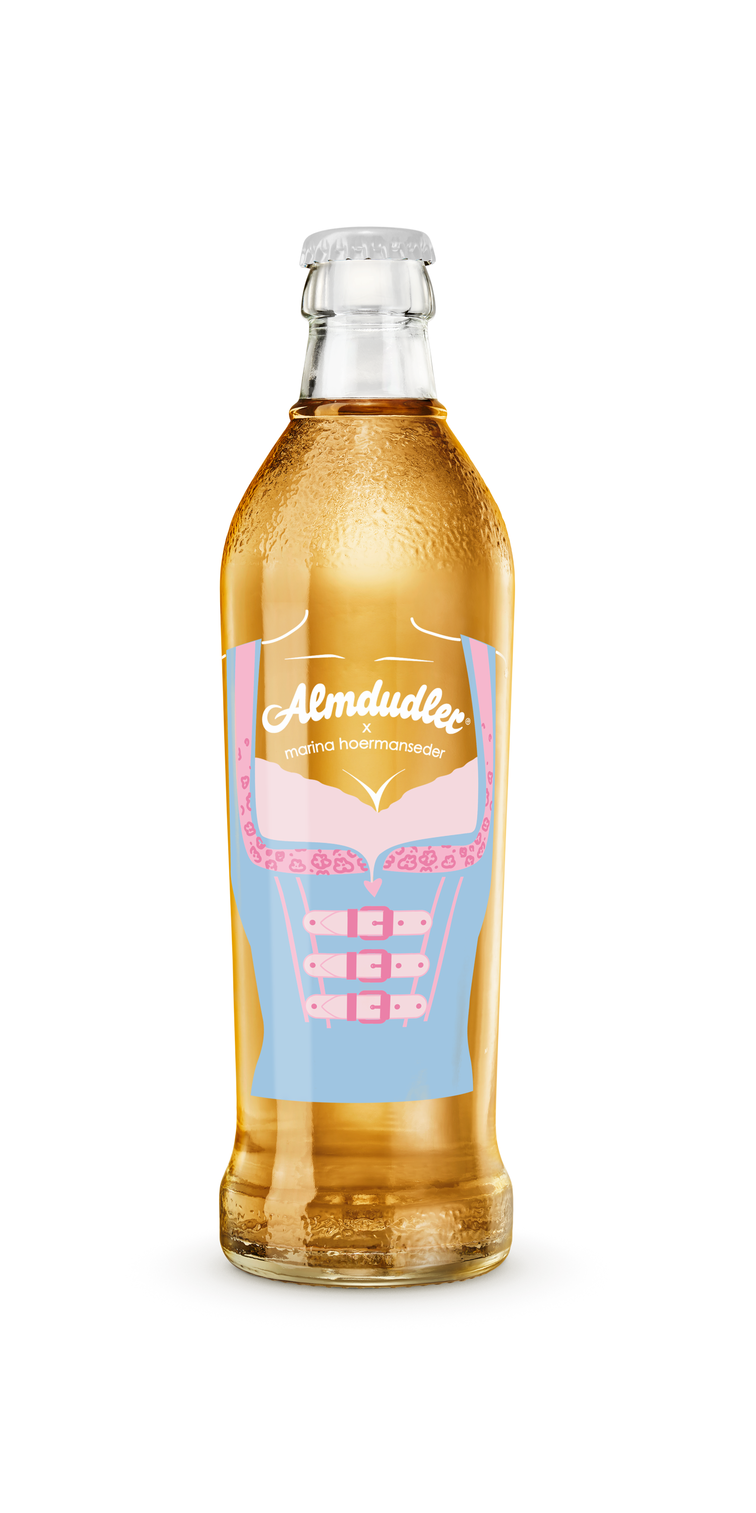 Mit viel Liebe zum Detail hat Marina Hoermanseder das berühmte Almdudler Trachtenpärchen neu interpretiert: Ihre charakteristischen Schnallen und verspielten Elemente finden sich auf den Flaschen und einem Tonkrug wieder – inspiriert von traditionellen Lederhosen und Dirndln, aber mit einem zeitgemäßen Twist. „Ich wollte die Almdudler-Tracht mit einem Augenzwinkern modernisieren. Meine Schnallen-Elemente passen perfekt zur Marke und zum Anlass. Herausgekommen ist eine verspielt-moderne wie auch starke Kollektion, die Tradition und Popkultur vereint", erläutert Marina Hoermanseder, bekannt für ihre extravaganten Designs, getragen von Stars wie Lady Gaga oder Rihanna.