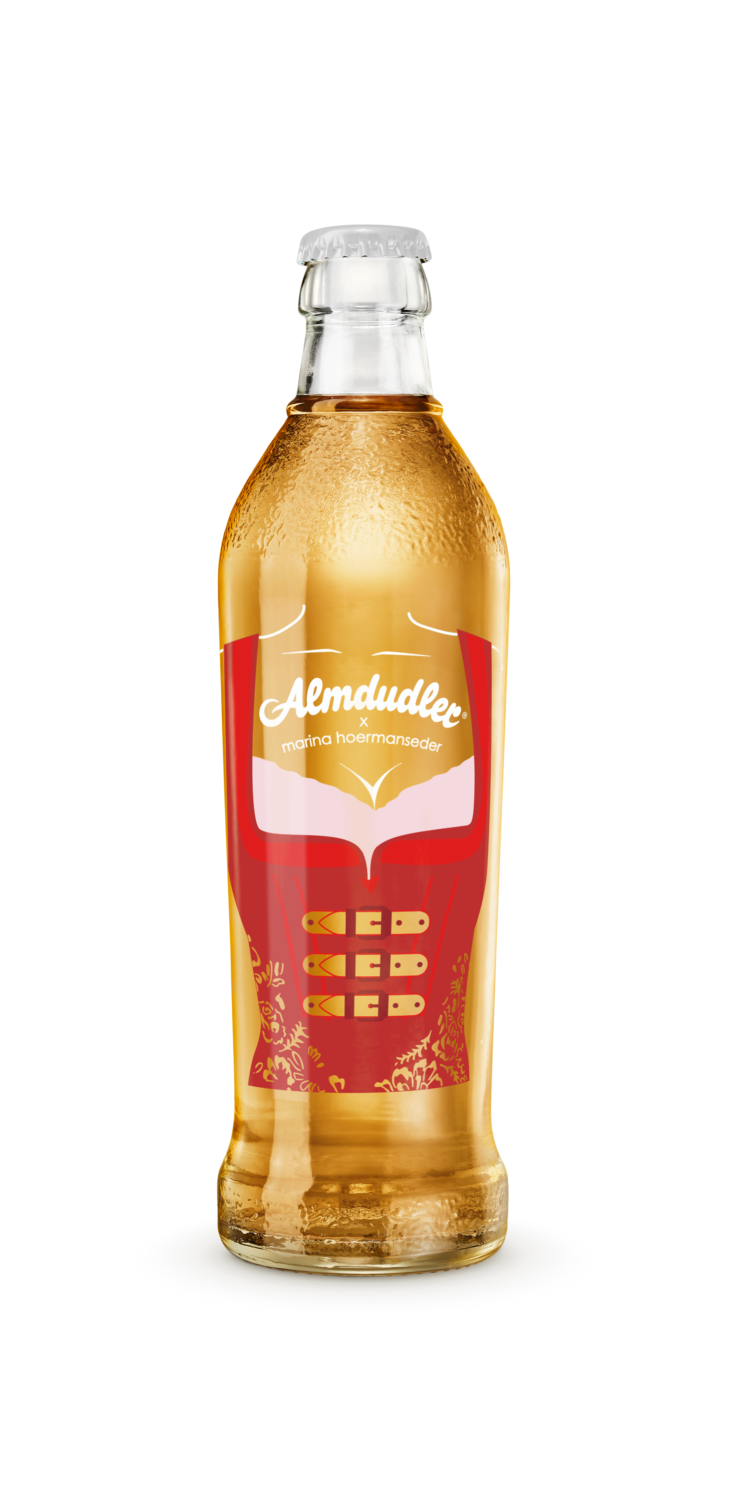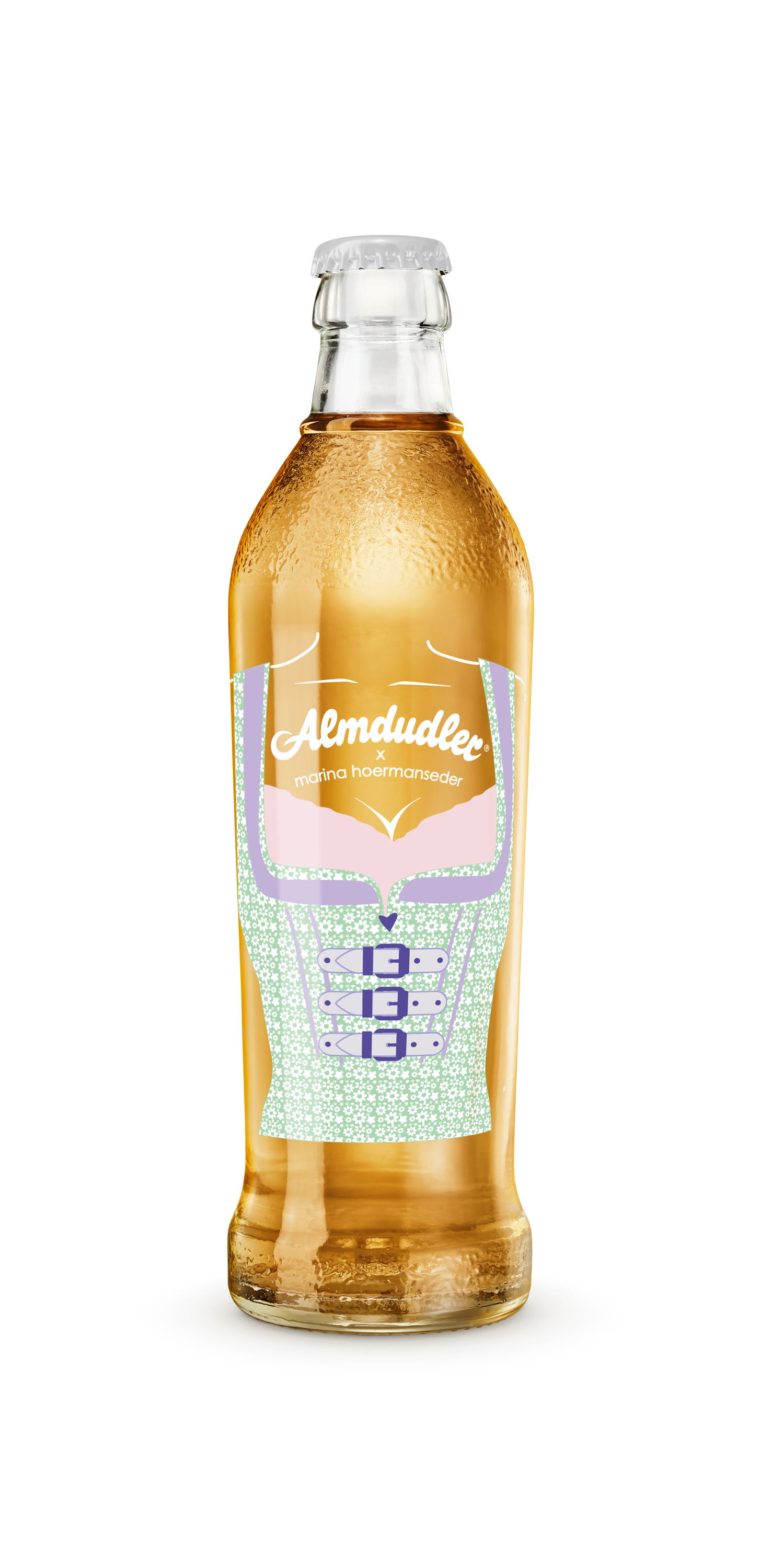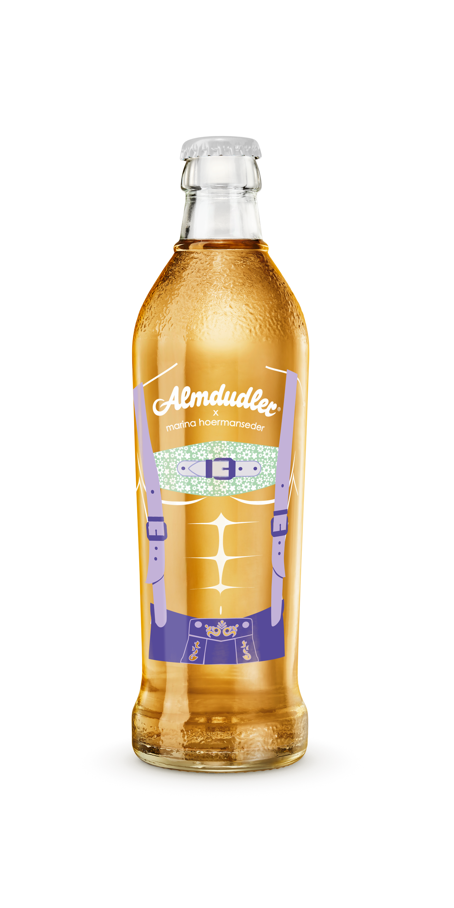 Mit viel Liebe zum Detail hat Marina Hoermanseder das berühmte Almdudler Trachtenpärchen neu interpretiert: Ihre charakteristischen Schnallen und verspielten Elemente finden sich auf den Flaschen und einem Tonkrug wieder – inspiriert von traditionellen Lederhosen und Dirndln, aber mit einem zeitgemäßen Twist. „Ich wollte die Almdudler-Tracht mit einem Augenzwinkern modernisieren. Meine Schnallen-Elemente passen perfekt zur Marke und zum Anlass. Herausgekommen ist eine verspielt-moderne wie auch starke Kollektion, die Tradition und Popkultur vereint", erläutert Marina Hoermanseder, bekannt für ihre extravaganten Designs, getragen von Stars wie Lady Gaga oder Rihanna.