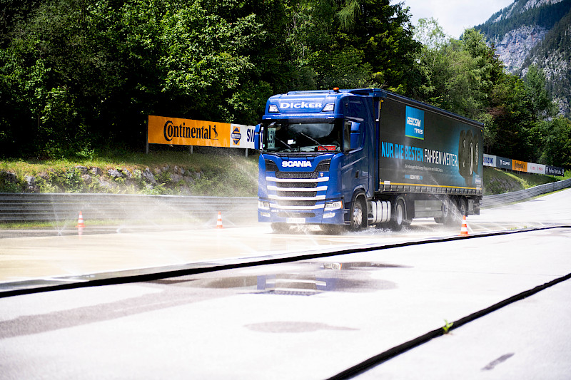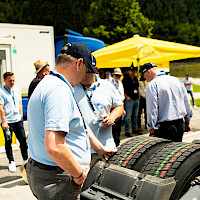 Ein besonderer Höhepunkt war die praxisnahe Live-Demonstration am ÖAMTC-Gelände: Christoph Priewasser präsentierte mit dem K 736 (für Antriebsachsen) und dem K 810 (für Trailer) zwei neue Laufflächendesigns, die sich derzeit im Entwicklungsstadium befinden. Gemeinsam mit dem langjährigen Partnerunternehmen DICKER TRANSPORTE wurden die Profile unter realistischen Bedingungen getestet: auf trockener, nasser und winterähnlich glatter Fahrbahn. Dabei überzeugten beide Produkte jeweils mit ihrer individuellen Performance – einerseits mit Traktion, andererseits mit Bremsverhalten und Fahrstabilität. Die Leistungsfähigkeit der neuen Profile konnten die Teilnehmer hautnah erleben: Sie durften sich selbst hinter das Lenkrad setzen. Abgerundet wurde das Programm durch eine Mitfahrt im SCANIA E-LKW – ein weiterer Schritt in Richtung CO?-neutraler Zukunft des Güterverkehrs und ein deutliches Signal für nachhaltige Mobilität.